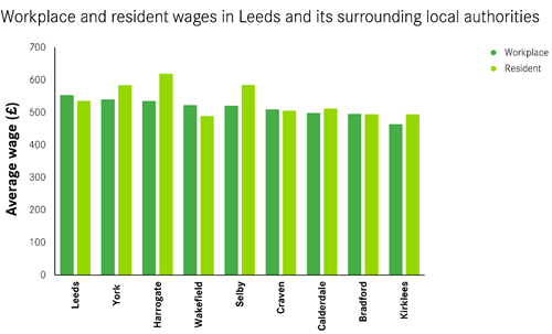 This creates benefits for not just residents in the city but also for those living around it. The most recent data* indicates the wages of workers in Leeds were higher than the wages of its residents. This tells us that higher-paid jobs in Leeds were disproportionately being done by people who lived outside of the city. On the flip side, resident wages were higher in Harrogate and York, with residents here benefitting the most from high-paid jobs elsewhere.